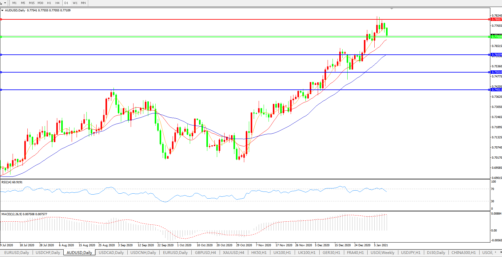 交易策略:0.7700下方看跌,目标0.7600、0.7500