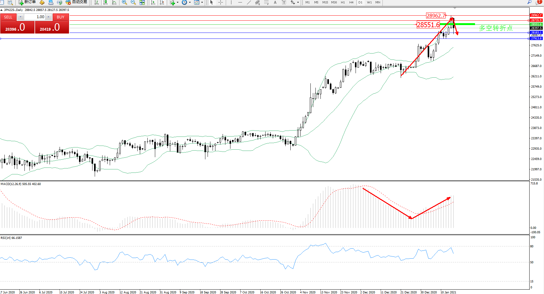 技术点评:多头动力延续布林带指标通道上轨附近持续震荡上扬态势良好,高位抵达28962位置节点后短暂遇阻出现回撤下行,布林带指标呈缓慢张口走势持续中,关注高位附近关键节点,MACD指标处于多头区域维持震荡上扬走势持续中,RSI指标处于多头区域持续震荡上移至80均衡线附近节点后短暂遇阻回撤;