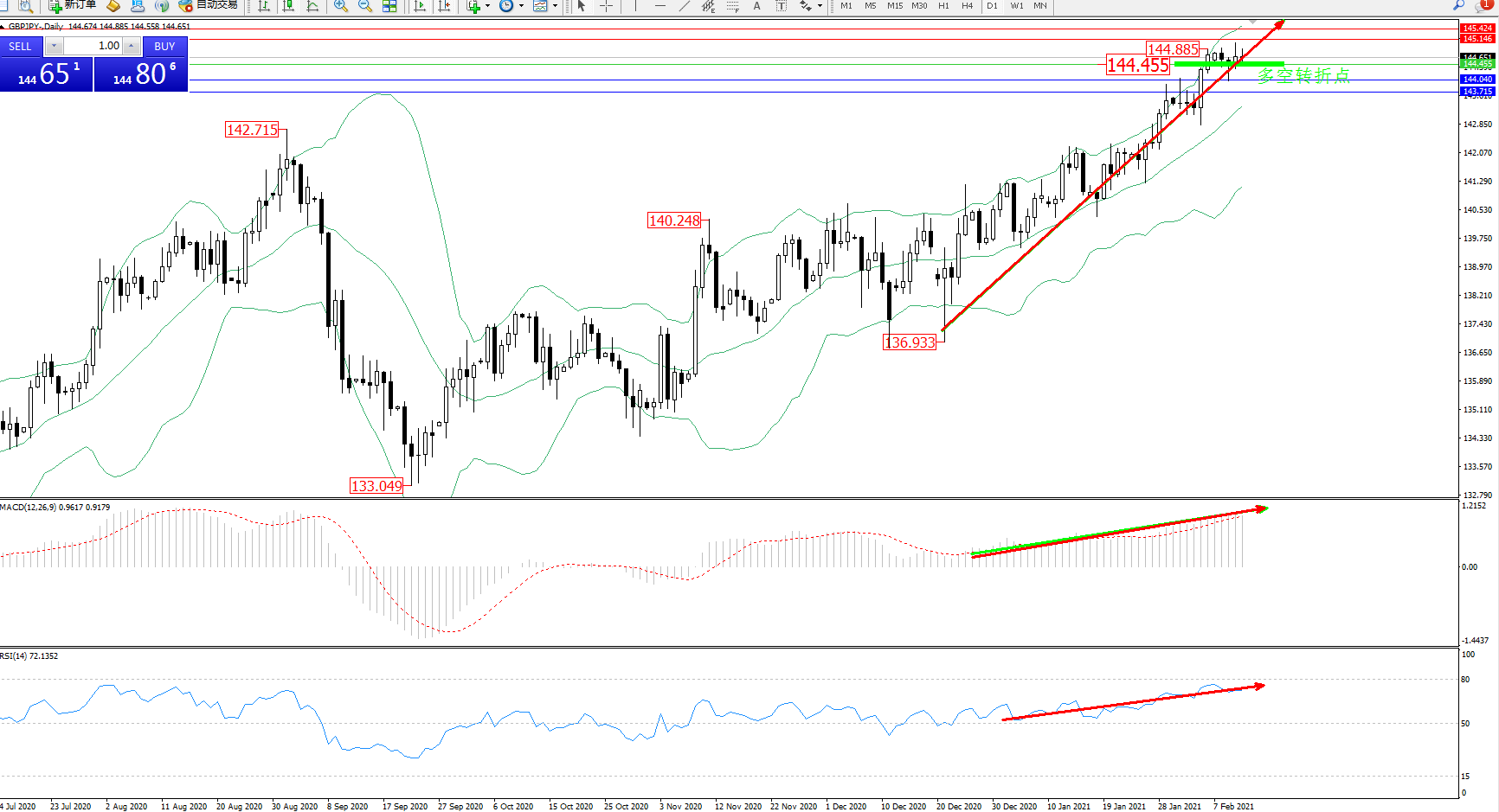 技术点评:多头动力延续布林带指标通道中上轨区间持续震荡上扬,高位抵达144.885附近节点后维持短暂整理有下行迹象,布林带指标呈上行走势后有收口迹象,MACD指标处于多头区域平缓向上移动态势良好,RSI指标处于多头区域维持整理上行后有平缓下行迹象;’