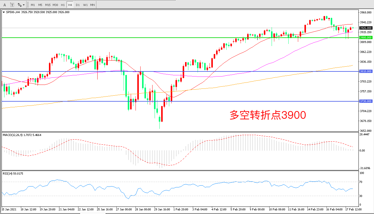 4小时图看,标普500长阳拉升后延续高位震荡,整体表现依然强势3900成为下方支撑,均线系统呈多头排列,MACD红柱缩短RSI指标走平,日内延续震荡概率较大。