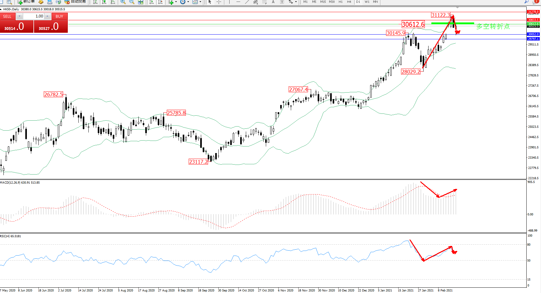技术点评:多头动力延续布林带指标通道中上轨区间持续震荡上扬态势良好,高位突破上轨附近节点至31122位置后遇阻短暂回撤震荡中,布林带指标呈收口走势后开始有张口迹象,关注上轨下方附近节点,MACD指标处于堵头区域持续震荡上扬中,RSI指标处于多头区域持续震荡上扬后开始反转整理;