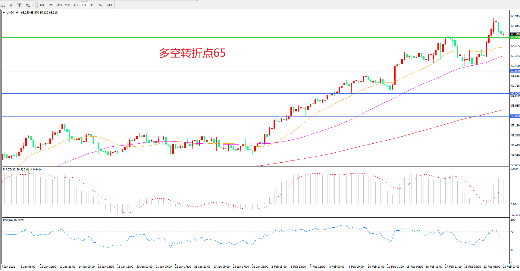 4小时图看,油价连续走高后出现调整,但整体依然表现强势,65美元形成下方支撑,均线系统呈多头排列,MACD红柱缩短,RSI指标走平,日内震荡上行概率较大。
