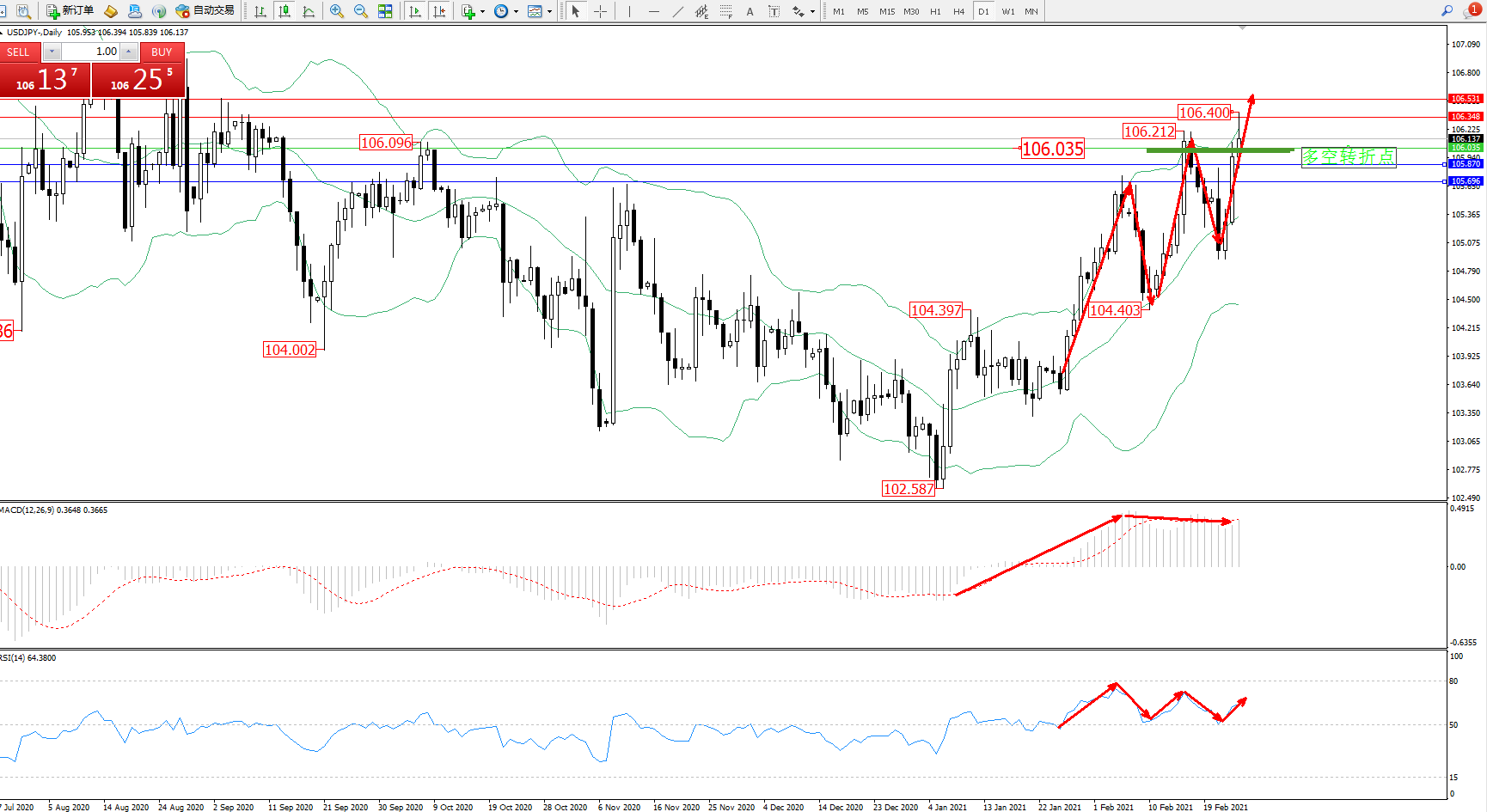 技术点评:多头动力延续布林带指标通道中上轨区间持续震荡上扬态势良好,多头强势拉升屡破新高,突破布林带指标上轨附近节点后抵达106.400附近整理中,关注上轨附近节点,MACD指标处于处于多头区域高位维持整理平移中,RSI指标处于多头区域多次触及50均衡线附近持续宽幅整理上移;