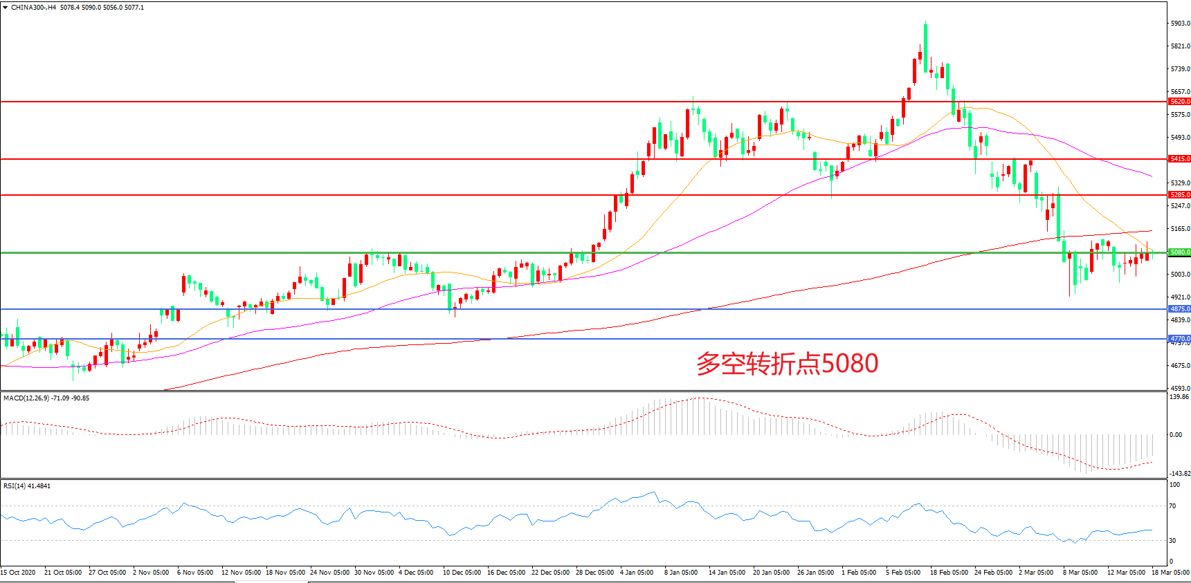 4小时图看,沪深300延续低位震荡,整体波幅不大,200周期均线成为上方阻力,21周期均线出现下穿,MACD绿柱增加,RSI指标走平,日内延续震荡概率较大。