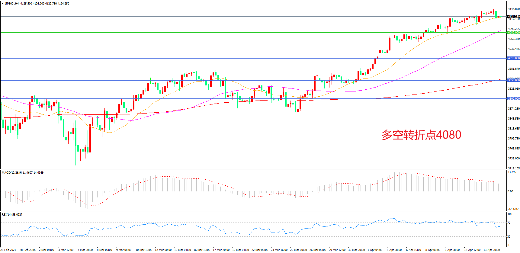 周三(4月14日),美联储主席鲍威尔四天内第二次提到美国经济进入加快增长的拐点,且未提及缩减QE的路线图,三大股指早盘集体走高,但特斯拉、苹果等龙头科技股盘中齐跌,拖累市场表现,标普500小幅上行,收报424.50点。在日内公布的美联储褐皮书中,对经济活动的描述从“小幅复苏”提升到“温和复苏”,市场风险情绪受到明显提振。