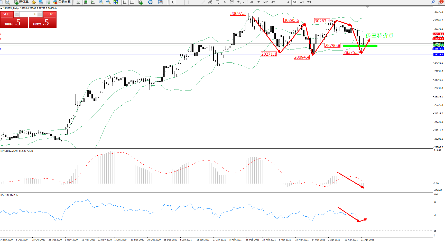 技术点评:长时间维持在布林带指标通道内处于宽幅震荡走势中,空头动力司机入场跌破布林带指标下轨附近节点后不断向下移动中,低位抵达28375附近得到短暂支撑多头伺机入场,反转回升,布林带指标呈张口走势后开始收口,但仍处于下轨附近弱势震荡中,MACD指标处于0轴线下方维持震荡后开始缓慢下挫,RSI指标空头动力弱势纠结于50均衡线下方空头区域不断下移;