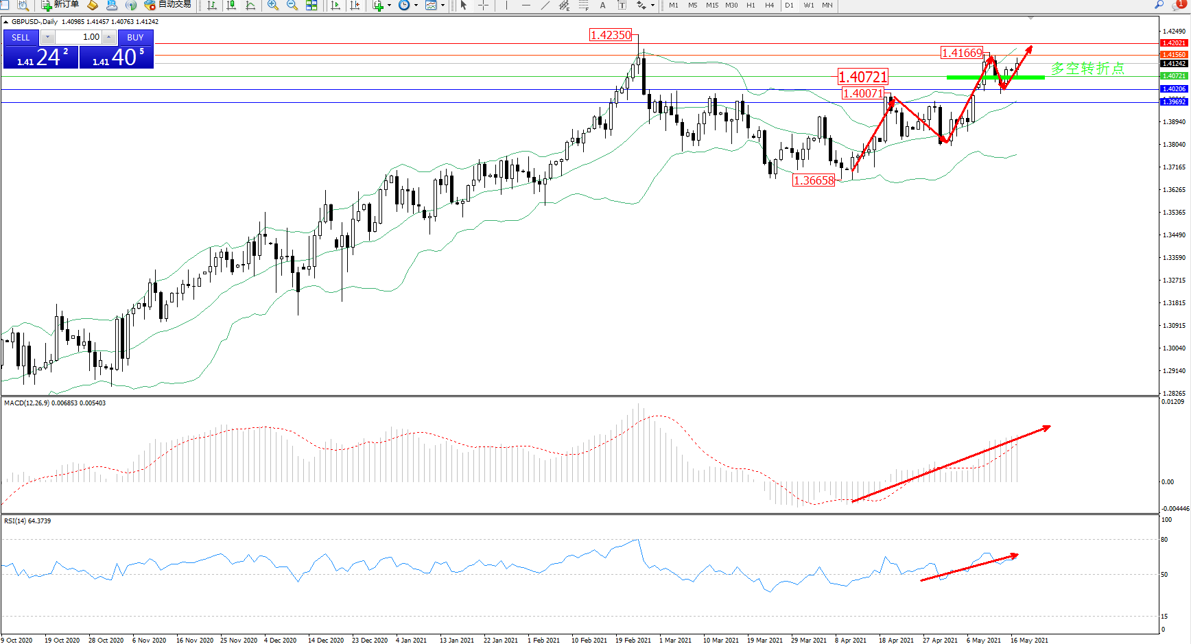 交易策略:1.40721上方看涨,目标1.41560、1.42021