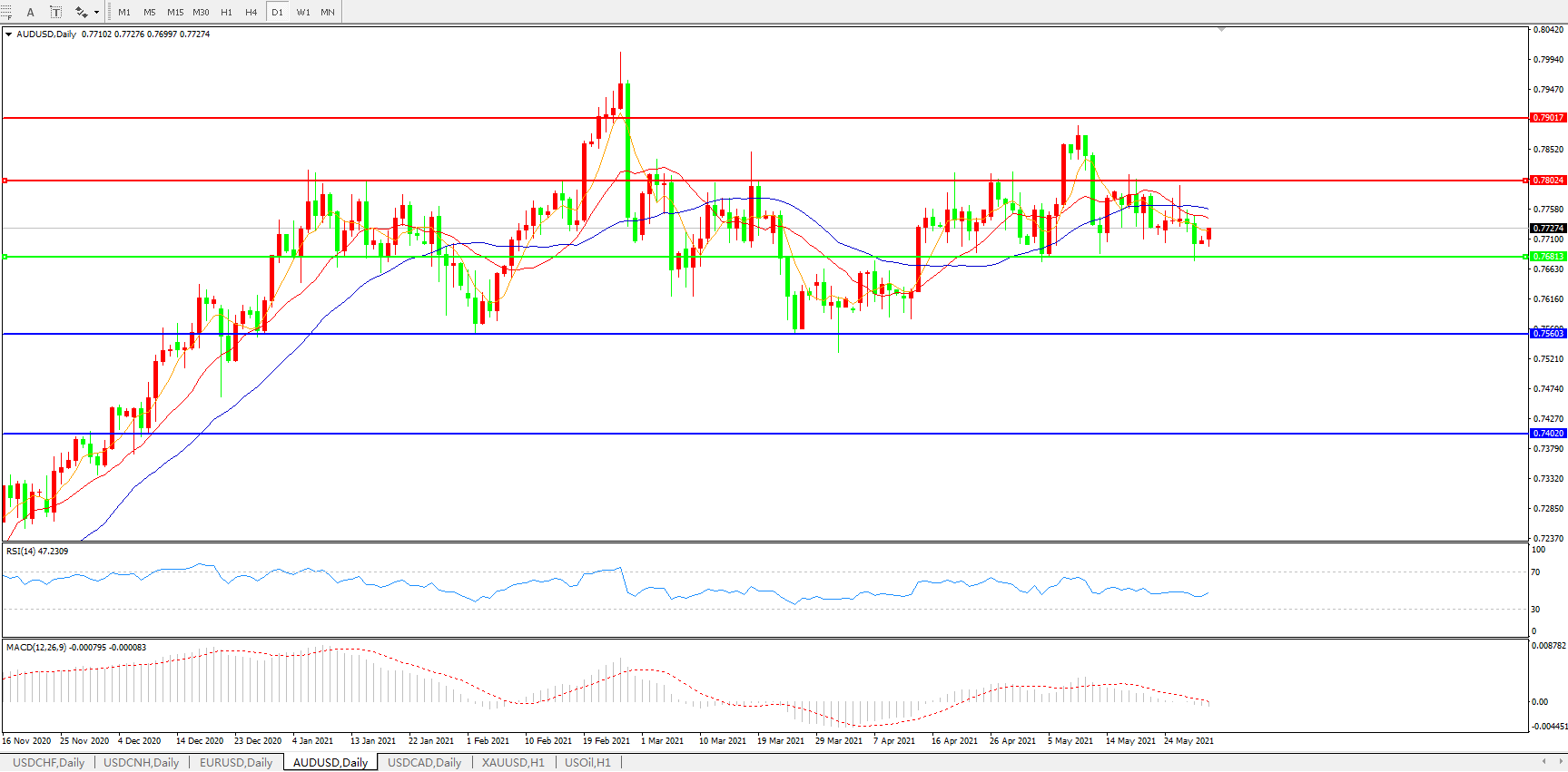 备选策略:0.7680下方看跌,目标0.7560、0.7400