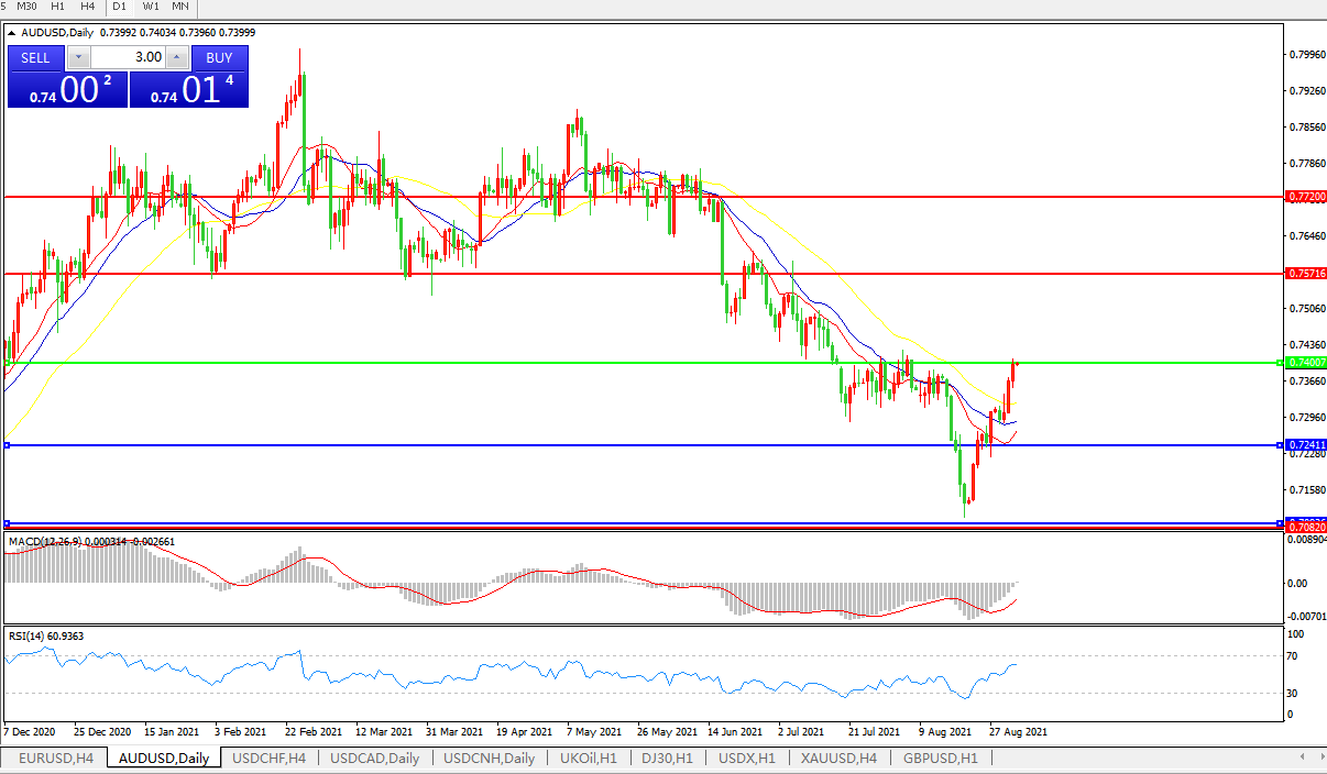 交易策略:0.7400上方看涨,目标0.7570、0.7720