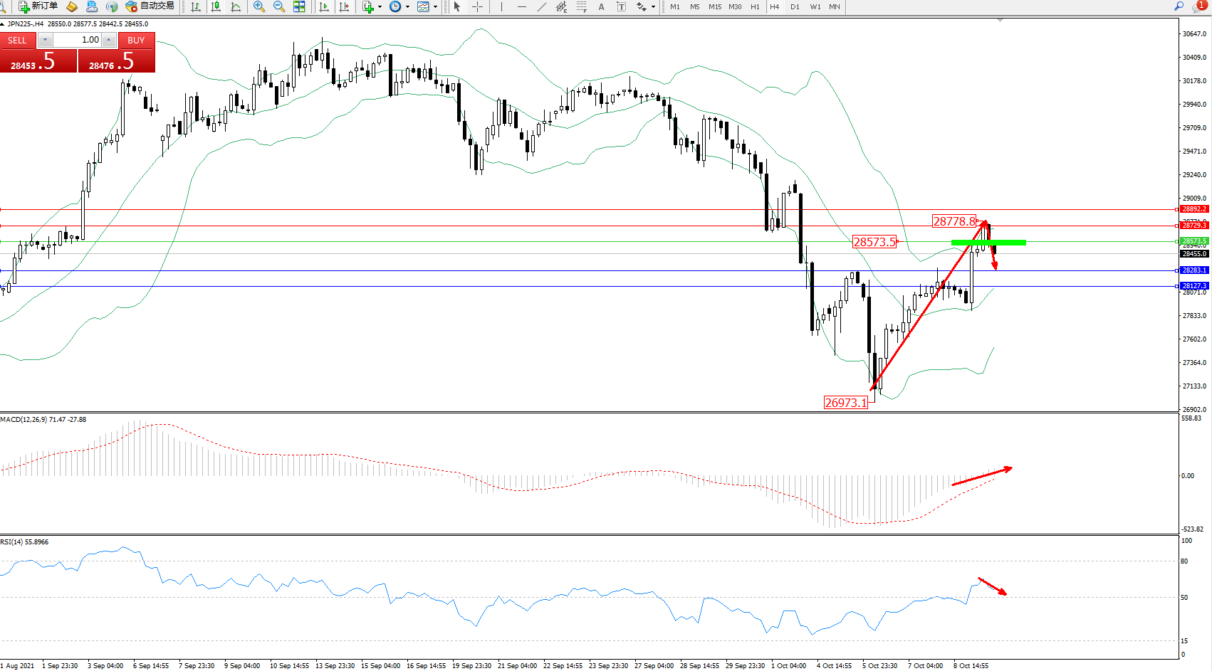 技术点评:多头动力延续布林带指标通道中上轨区间持续震荡上扬,高位抵达28778位置节点后遇阻调整回撤,短期多头动力开始遇阻,布林带指标呈上行趋势走势持续,呈缓慢收口走势中,MACD指标低位多头动力上移至0轴线上方徘徊,RSI指标出50均衡线上方弱势震荡中;