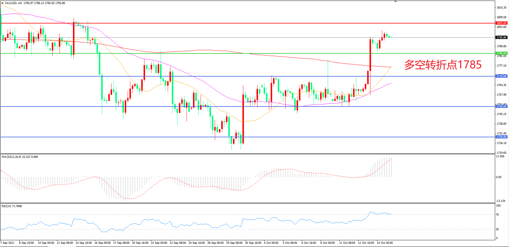 周四(10月14日),在美联储纪要几乎确认年内将开启缩减购债的情况下,美元多头获利回吐,美元指数和美债收益率继续回落,现货黄金触及一个月高位,收报1795.64美元/盎司。刺激措施减少和利率上调推高了债券收益率,提高了持有黄金的机会成本,目前基本面的利空以及多头的强势形成拉锯,短期看市场波动将进一步放大。