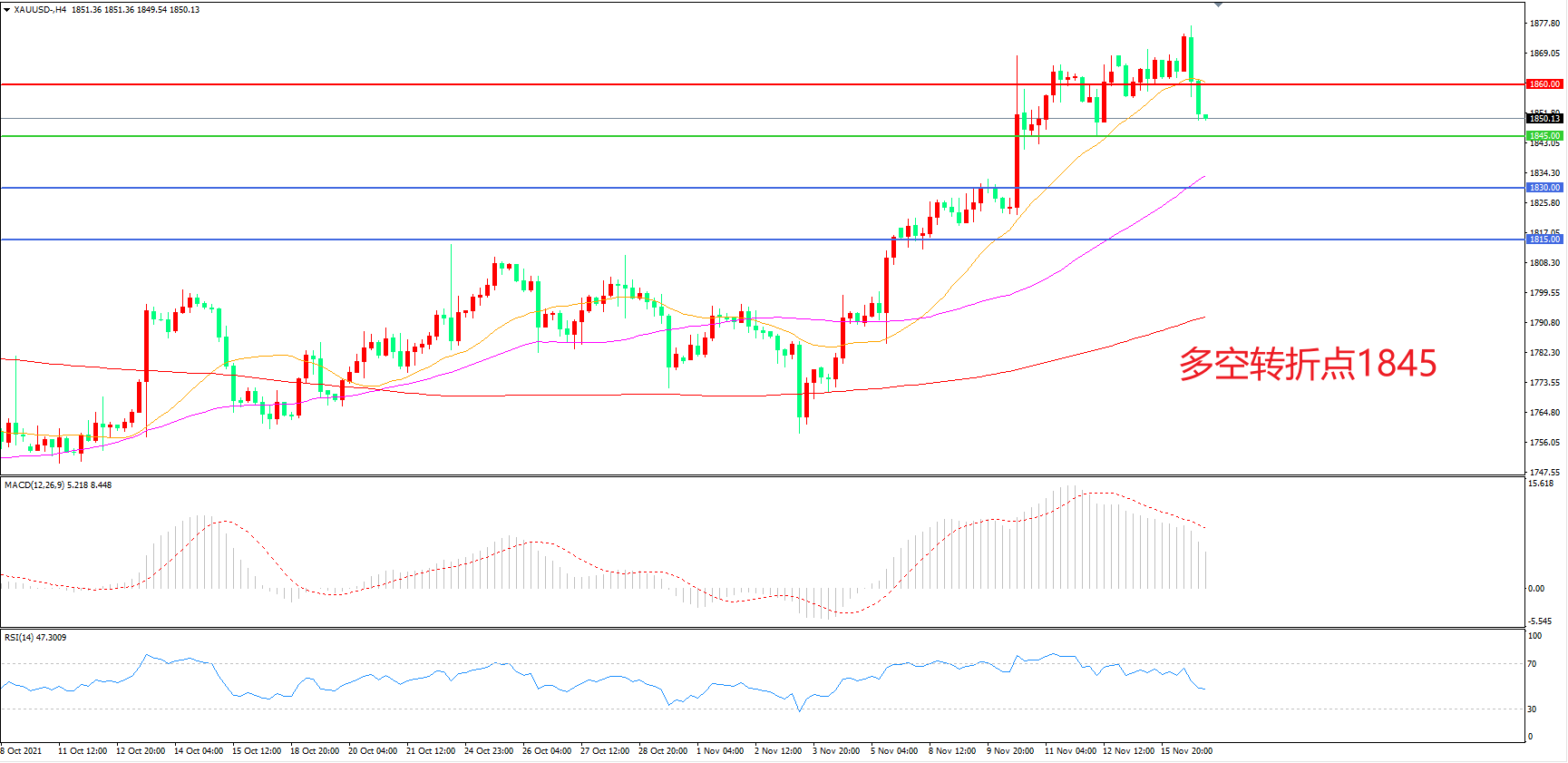 周二(11月16日),圣路易斯联储主席布拉德发表鹰派讲话,认为美联储应为对抗通胀加快速度Taper,美元逼近96关口,金价在连续大涨后出现回落,收报1850.17美元/盎司。目前市场对于美联储明年7月前加息的预期飙升,“鹰派”高官的数量正在逐渐增加,周内需继续关注美联储高管的讲话来判断美国未来的货币政策取向。