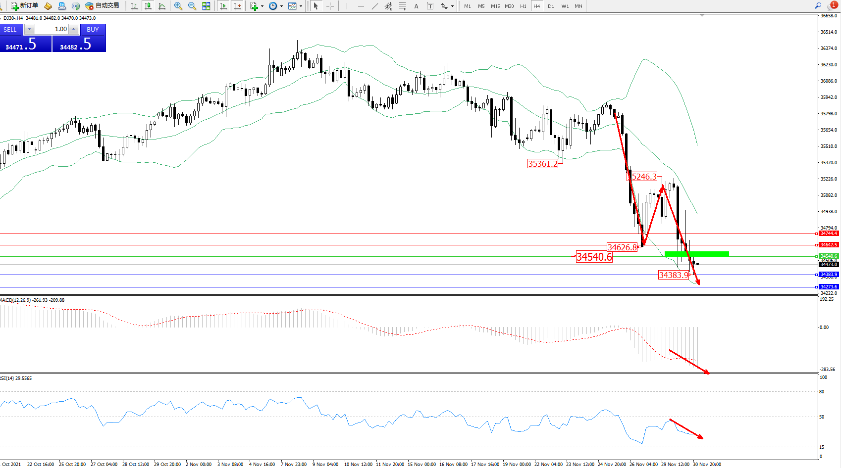 道琼斯指数11月30日(周二)收盘下跌651.76点,跌幅1.85%,报34484.18点;美股收盘,三大股指集体下挫,道指再度骤跌,美国国会预算办公室(CBO)周二响应了财政部长耶伦的警告,即国会若不提高债务上限,则联邦政府可能在12月中旬之后耗尽资金。国会预算办公室还注意到,财政部计划在12月15日向公路信托基金转移1180亿美元--这是拜登基建法案本月早些时候通过后的措施;如果债务上限保持不变,并且如果财政部全额进行计划中的资金转移,那么政府在转移资金后很快就会用尽根据特别措施举债的能力。在这种情况下,财政部很有可能在12月底之前耗尽现金。