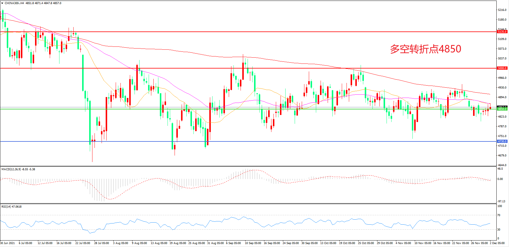 4小时图看,沪深300延续窄幅震荡,整体表现低迷,均线系统呈空头排列,4850成为多空分水岭,MACD绿柱增加,RSI指标走平,日内延续震荡概率较大。