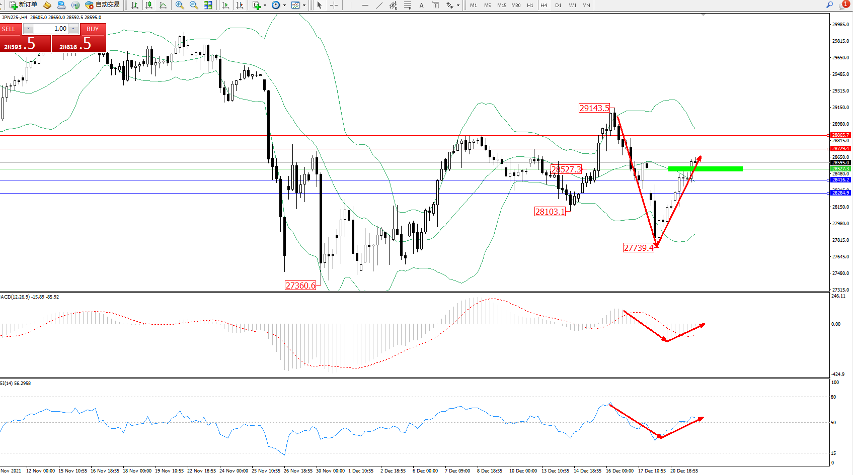 日经225指数12月21日(周二)收盘上涨584.69点,涨幅2.09%,报28522.50点。日本政府在12月报告中上调整体经济评估,为17个月来首次。消费者和企业对国内新冠病例下降的前景变得更加乐观。当局上调了对民间消费和商业状况的看法,但也指出供应限制和原材料价格带来的持续风险。防疫限制措施放宽为服务业提供了支撑。随着新冠病毒造成的严峻状况正在逐步缓解,经济正在回升。政府表示,有必要“密切关注”Omicron等冠状病毒变种对经济和金融市场带来的任何风险。政府连续第二个月上调对民间消费的评估。