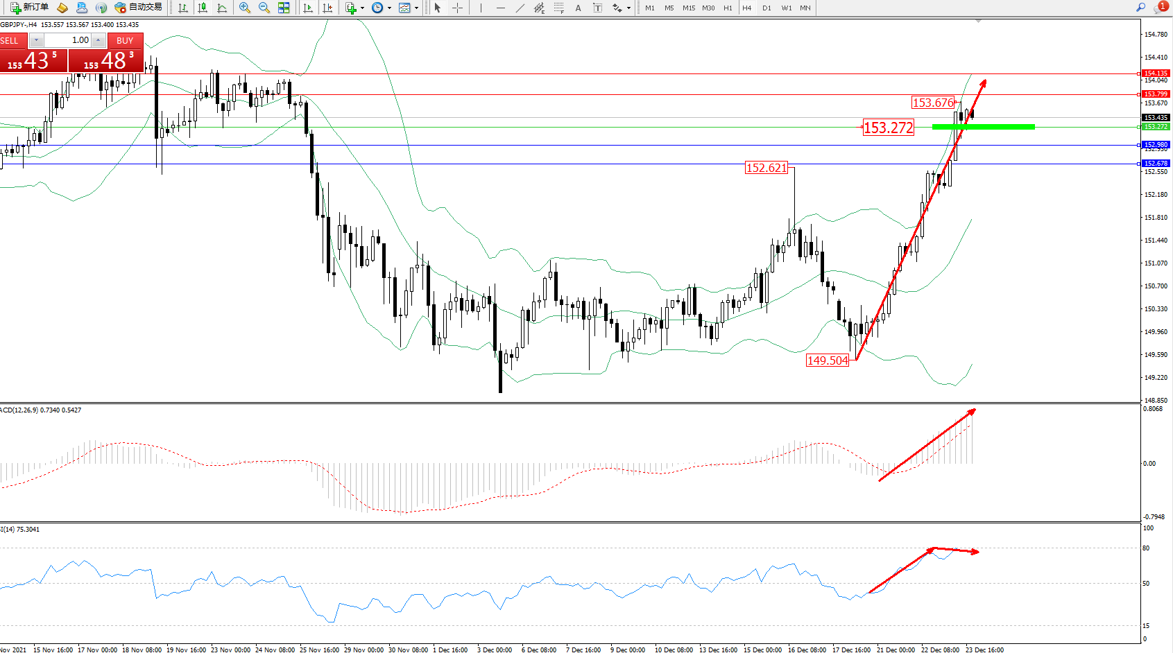 技术点评:多头动力延续布林带指标上轨附近持续震荡上扬,高位抵达153.676位置短期整理,多头动力有继续攀升态势,短期并未有止步迹象,布林带指标呈张口走势态势良好,低位有短暂收口迹象,MACD指标处于多头区域强势拉升上扬中,RSI指标处于多头区域维持整理上移至80均衡线下侧弱势徘徊;