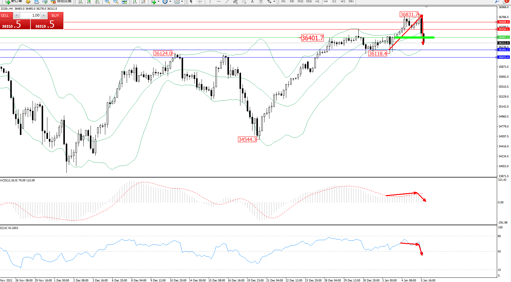 技术点评:多头动力延续布林带指标通道中上轨区间持续震荡上扬,高位抵达36831位置节点后遇阻回撤,急速下挫至布林带指标中下轨区间震荡,短期空头动力有继续下行迹象,布林带指标呈张口走势后开始收口,MACD指标处于多头区域维持整理平移后缓慢下行,RSI高位空头动力维持震荡下行,破50均衡线进入空头区域震荡;