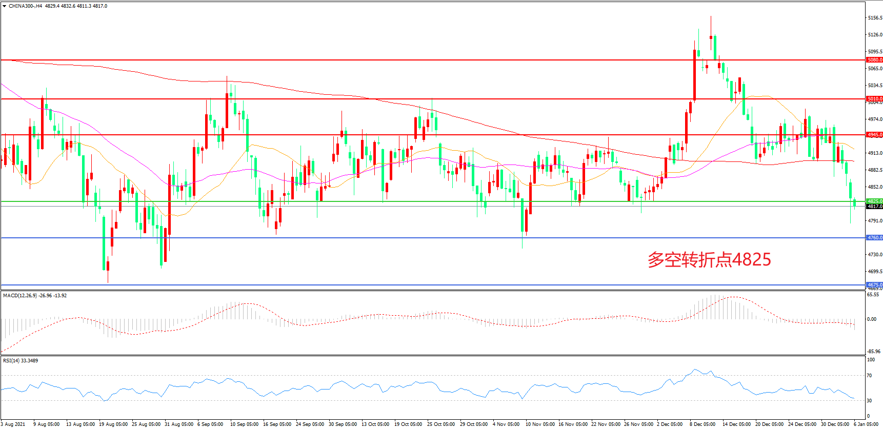 4小时图看,沪深300长阴连续下破,短期走势低迷,均线系统成为阻力,4825成为支撑, MACD绿柱增加,RSI指标走平,日内震荡下行概率较大。