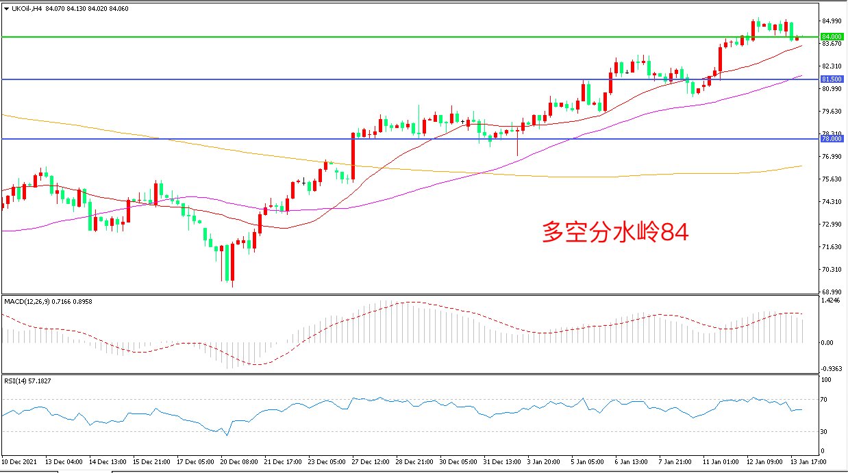 4小时图看,油价长阳拉升后小幅回落,整体表现依然偏强,均线系统呈多头排列,84美元成为多空分水岭,MACD红柱缩短,RSI指标走平,日内震荡上行概率较大