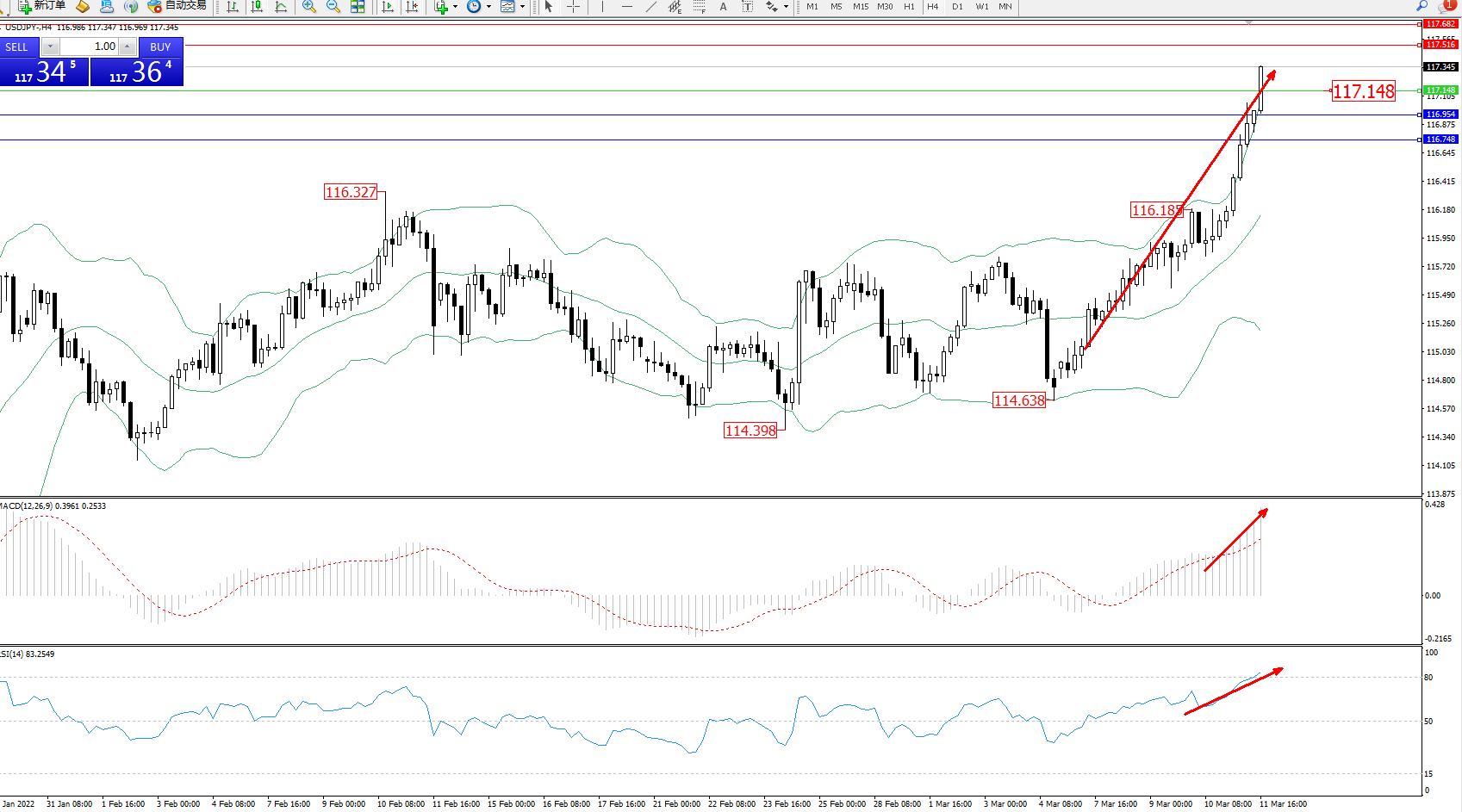 美元兑日圆维持117.345附近震荡,俄乌战事进入第三周,国际社会对俄罗斯的严厉制裁引发金属、石油和天然气等大宗商品价格飞涨,通胀预期明显升温,投资者权衡全球经济增长受到的影响,避险资金流入美元。美国公布强劲通胀报告后,美元兑日元一度涨至至117.05,为2017年1月以来最高位。美元兑日元看起来主要是收益率因素驱动。似乎日本央行按兵不动和美联储准备升息 之间令人无法忽视。