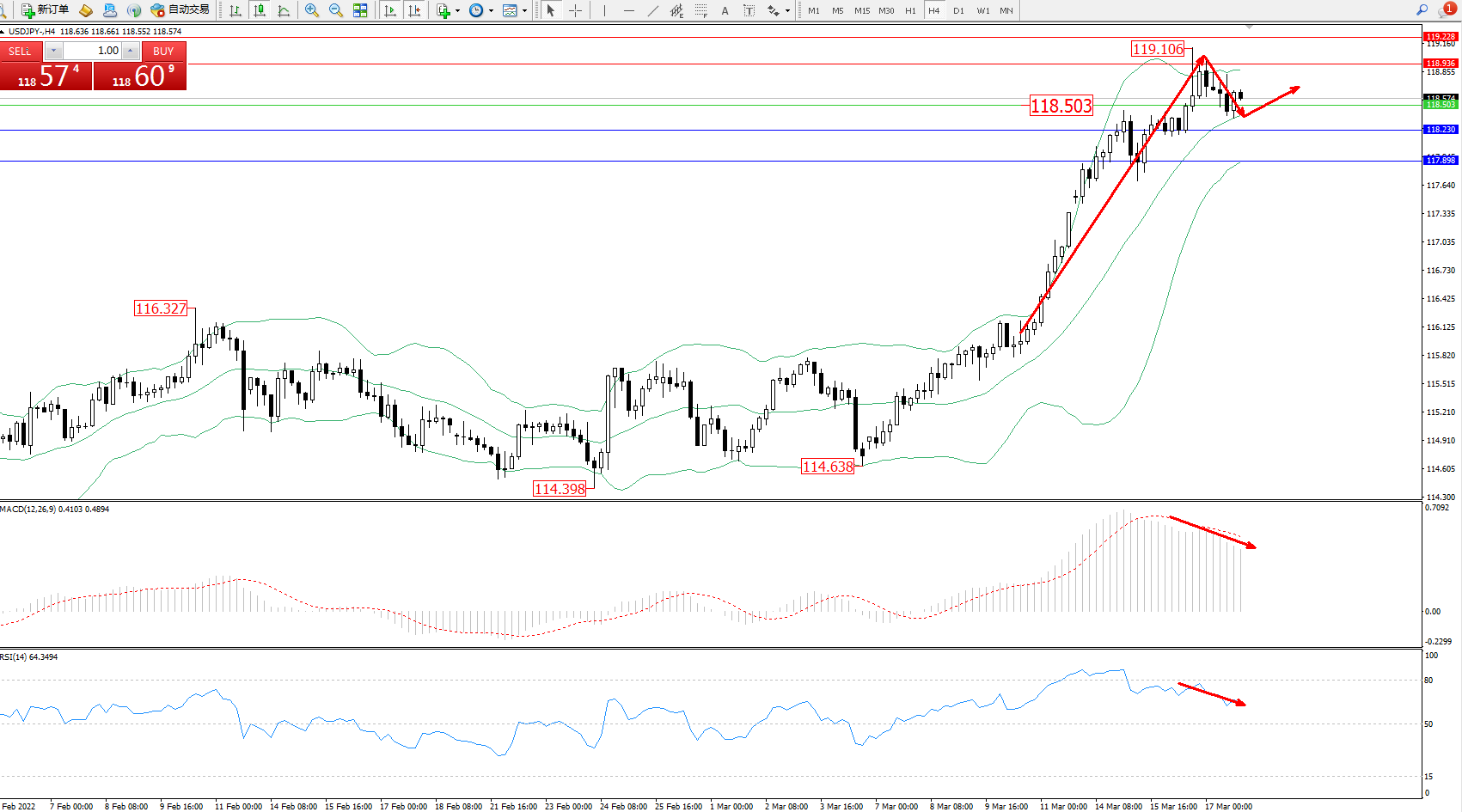 备选策略:118.503下方看跌,目标118.230、117.898