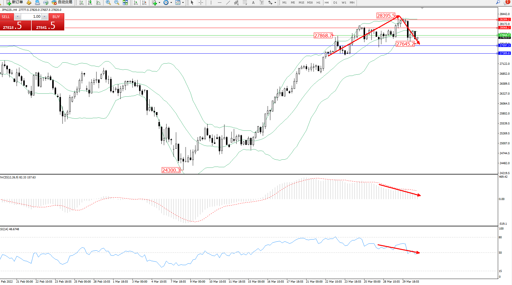 技术点评:多头动力延续布林带指标通道中上轨区间持续震荡上扬,高位抵达28395位置节点后遇阻回撤,短期触及布林带指标下轨至27645附近节点后开始徘徊,布林带指标呈收口走势平移中,MACD指标处于多头区域维持震荡缓慢下行,RSI指标处于多头区域维持震荡下移至50均衡线附近整理中;
