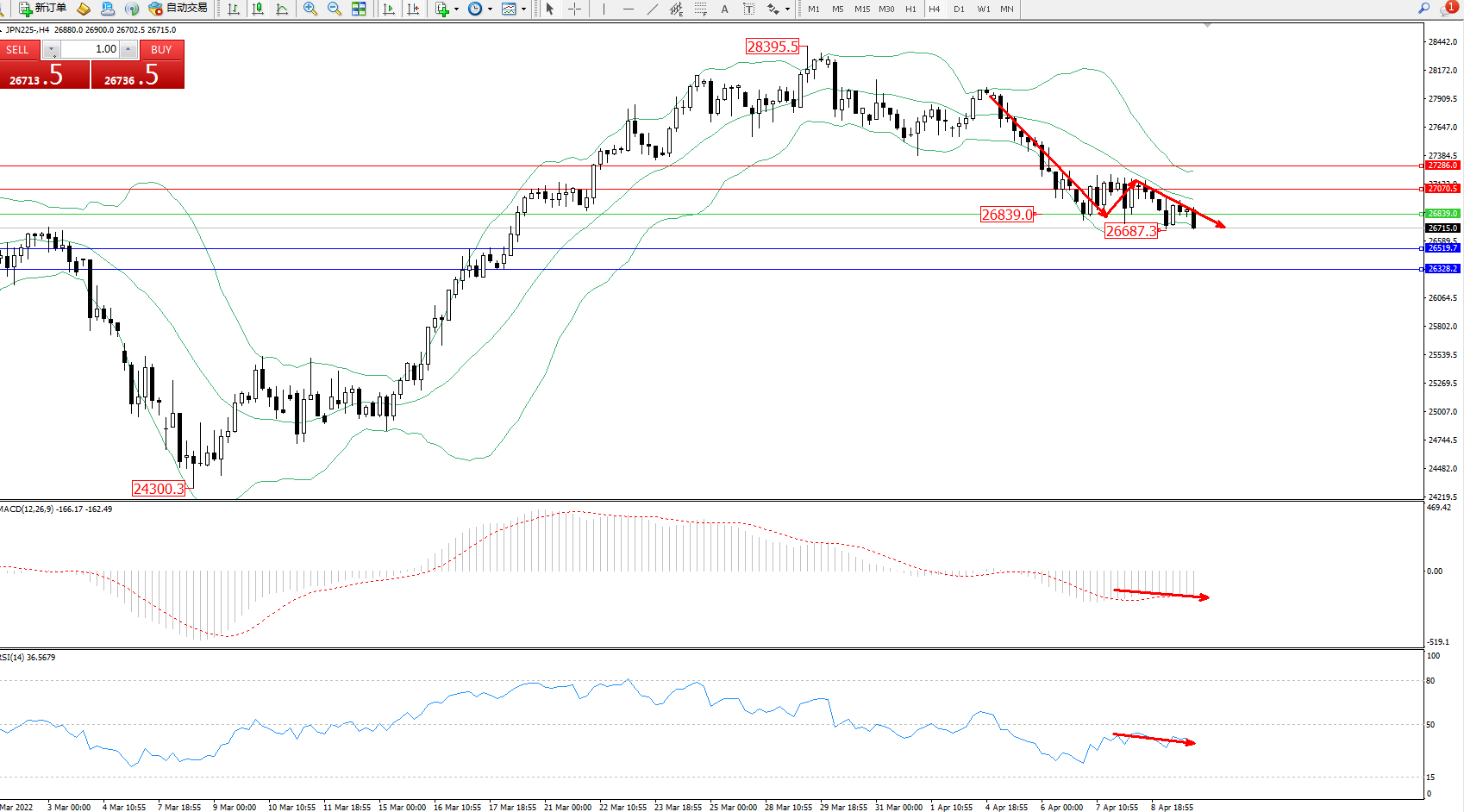日经225指数4月11日(周一)收盘下跌163.30点,跌幅0.61%,报26822.50点。日本央行公布对各地区经济的报告,下调了对8个地区的评估,1个地区的评估维持不变。许多地区的经济仍在复苏,但有8个地区下调了对疫情的再次爆发、供应紧张等问题的看法。