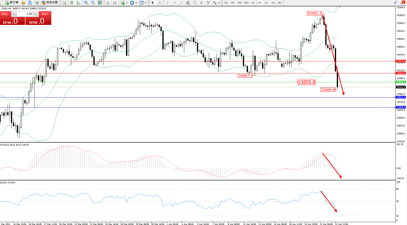 技术点评:高位空头动力急速重挫,跌破布林带指标下轨至33689附近节点后整理,布林带指标呈张口走势态势良好,高位短期跌势未见最终止步迹象,MACD指标空头动力急速下挫至0轴线下侧持续下行,RSI指标处于50均衡线下侧空头区域不断向下移动中;