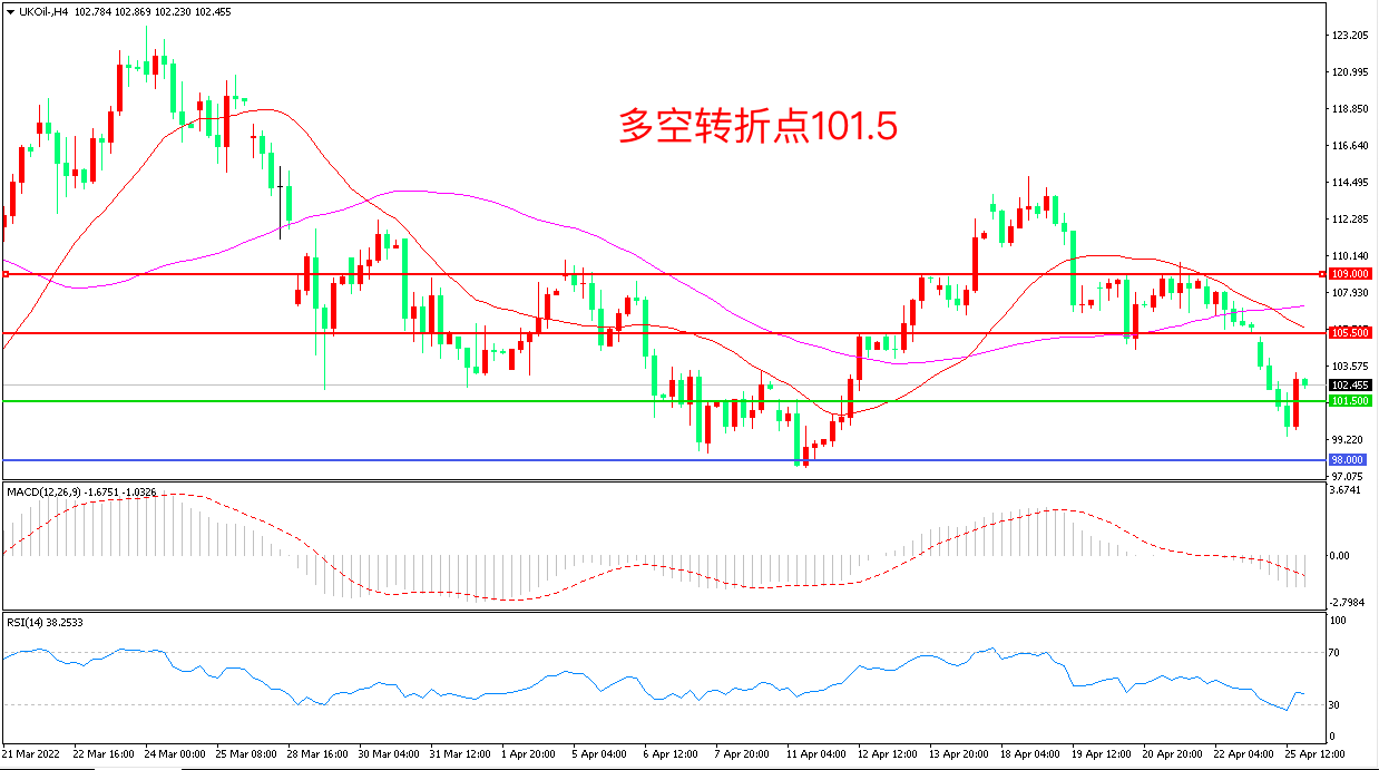 周一(4月25日),疫情令市场担心需求不振,加之美元走强施压,风险资产遭到抛售,布伦特原油震荡下行,收报102.45美元/桶。目前恐慌悲观情绪笼罩整个市场,但好在原油市场自身库存低位大背景下,还是限制了资金做空冲动,虽然油价自身还是相对抗跌,但预计仍将以弱势震荡为主。