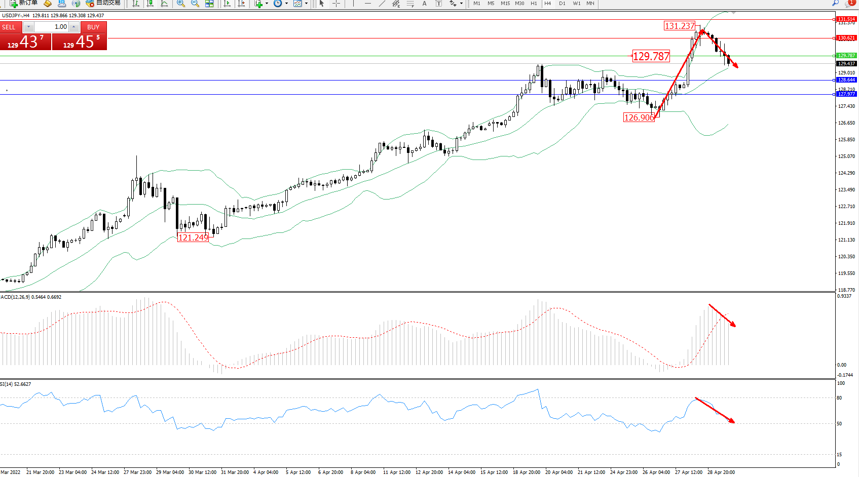 交易策略:129.787下方看跌,目标128.644、127.977