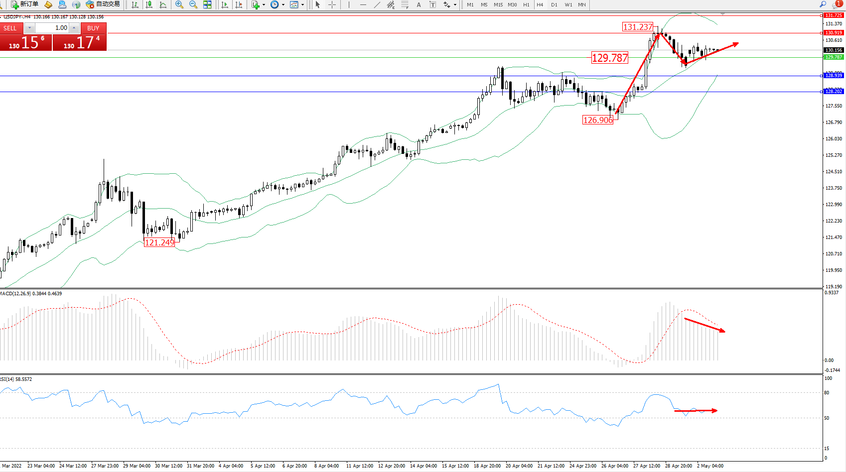 技术点评:多头动力延续布林带指标通道中上轨附近持续震荡上扬,高位抵达131.237附近节点后短期回撤,再度延续中轨持续向上拉升,布林带指标呈收口走势中,MACD指标处于多头区域维持弱势下行,RSI指标处于50均衡线上側窄幅整理平移中;