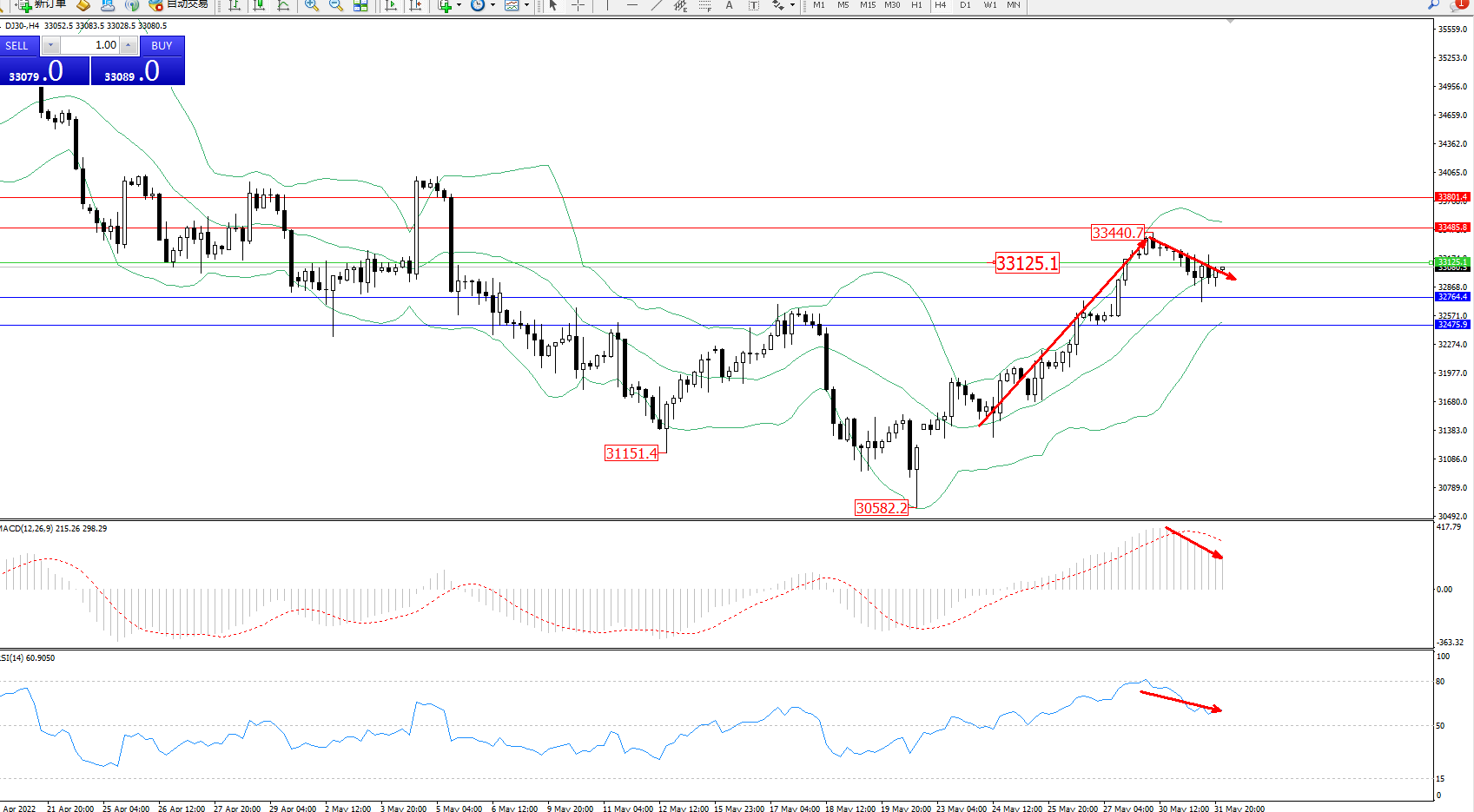 备选策略:33125上方看涨,目标33485、33801