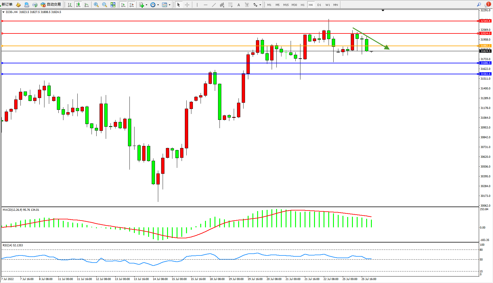道琼斯指数7月25日(周一)收盘上涨90.75点,涨幅0.28%,报31990.04点;隔夜指数掉期显示,美联储将在本周将加息75个基点。随后,预计美联储将在今年年底前将联邦基金利率提高到3.3%左右。