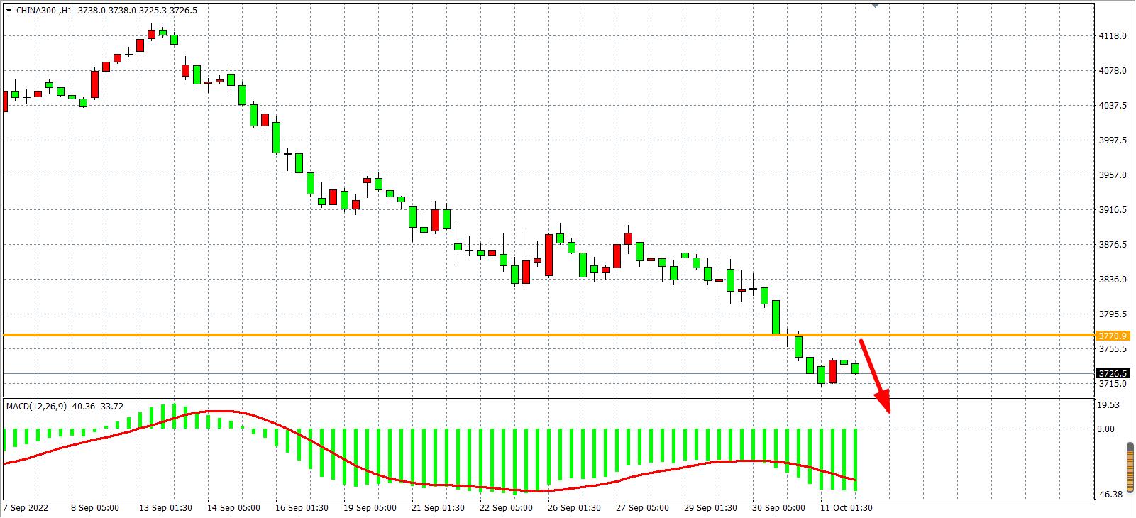 1小时图看,沪深300小幅反弹后再度出现受阻,同时MACD在零轴之下仍旧处于放量状态,显示趋势延续下跌概率较大,目前阻力主要集中于3770附近,日内在该位之下继续看跌,下方目标看3700-3660。