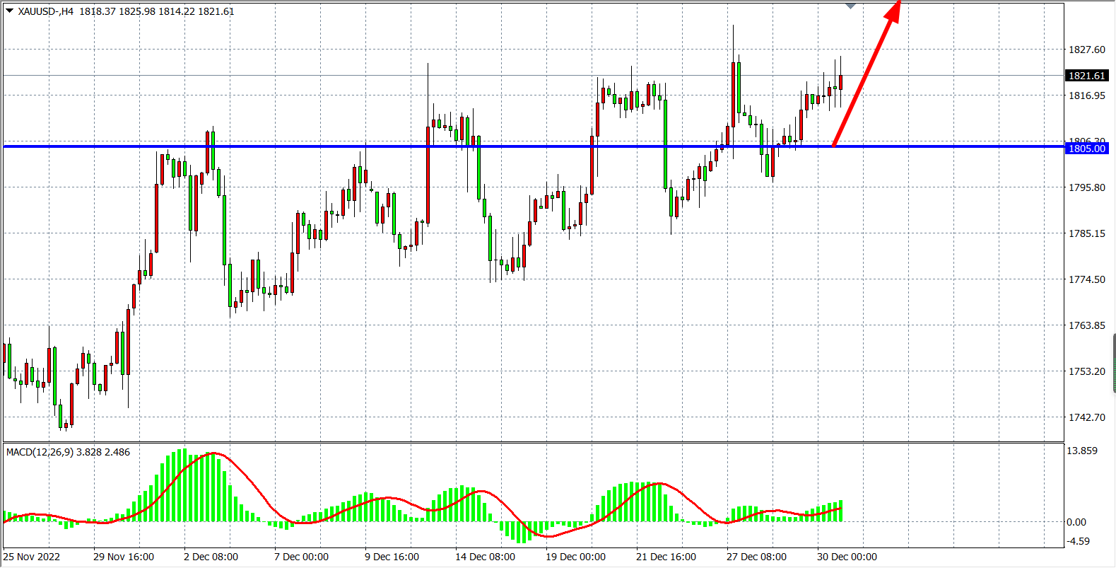 交易策略:在1805.00 之上看涨,目标1820.00         1835.00