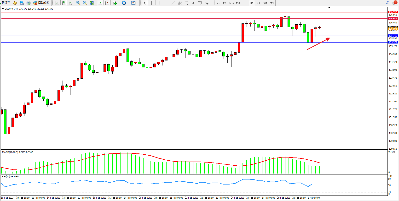 4小时图看:高位短期震荡回撤,多头反转上移,市场多头情绪再度涌现,MACD指标处于多头区域维持整理,RSI指标处于50均衡线上側徘徊;