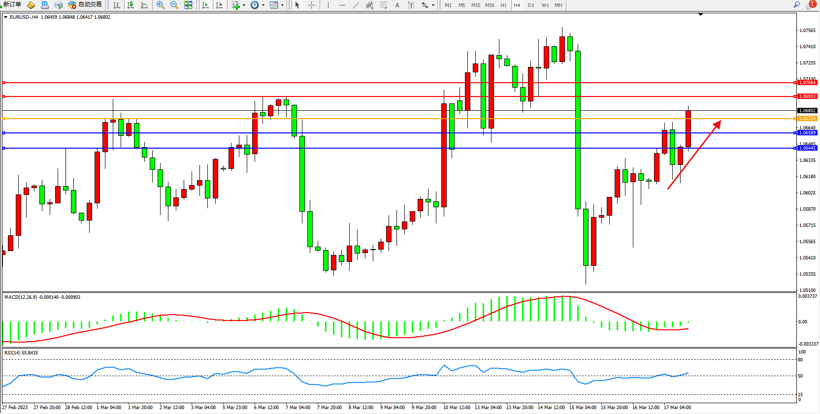 4小时图看:多头动力维持震荡持续拉升,短期看涨情绪笼罩,市场多头不断上扬中,MACD指标处于0轴线下侧缓慢上移,RSI指标处于50均衡线附近整理上行;