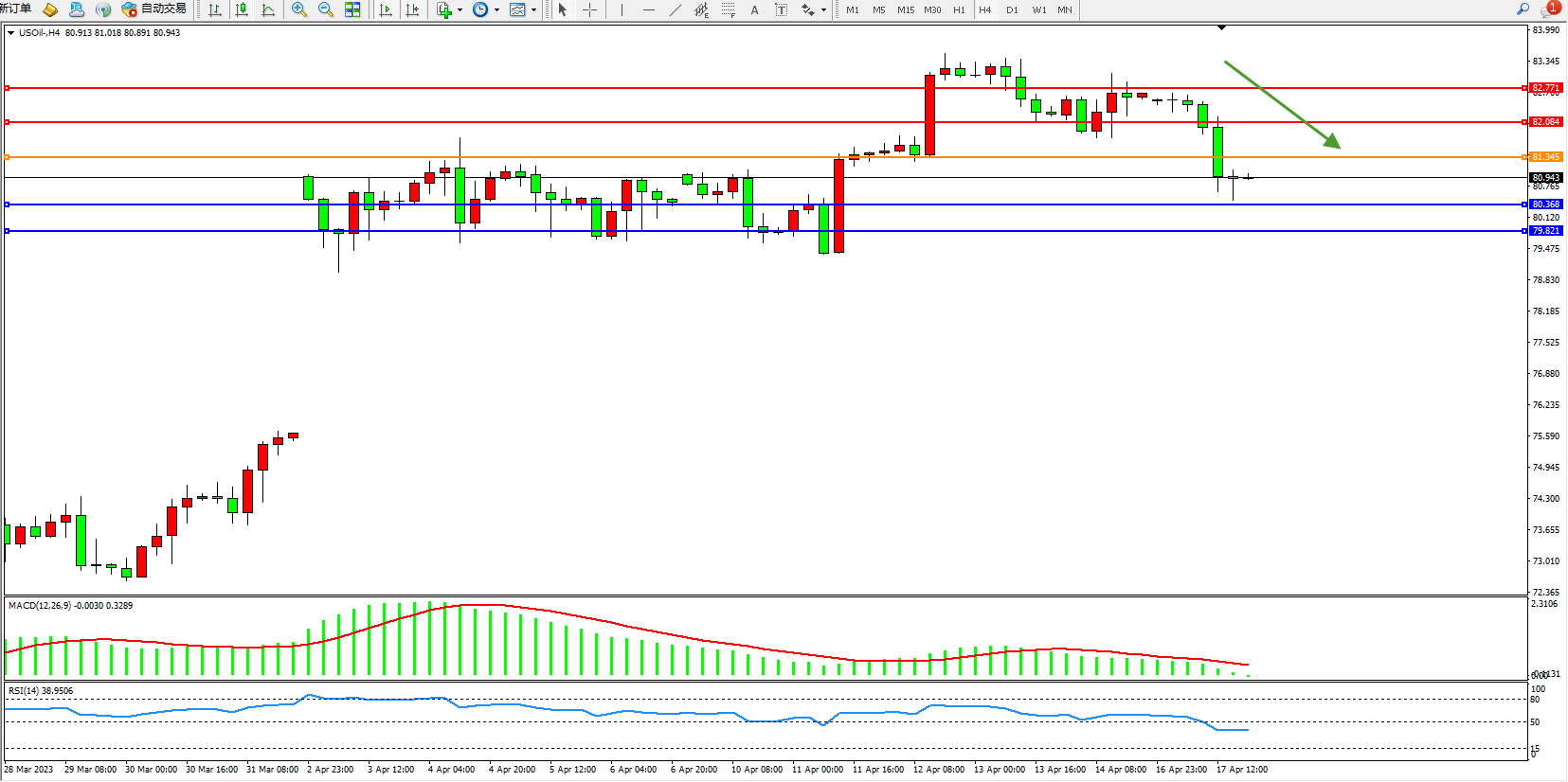 4小时图看:高位空头动力持续震荡下移,短期跌势或将延续,市场空头情绪笼罩,MACD指标处于0轴线上側缓慢下行,RSI指标处于50均衡线下侧弱势整理;