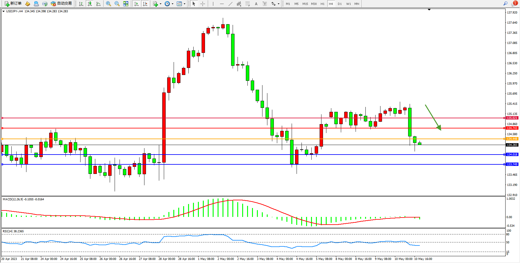 4小时图看:空头动力震荡下移,短期跌势或将持续,市场整体处于空头下行走势中,MACD指标处于0轴线附近徘徊,RSI指标处于50均衡线下侧弱势整理;