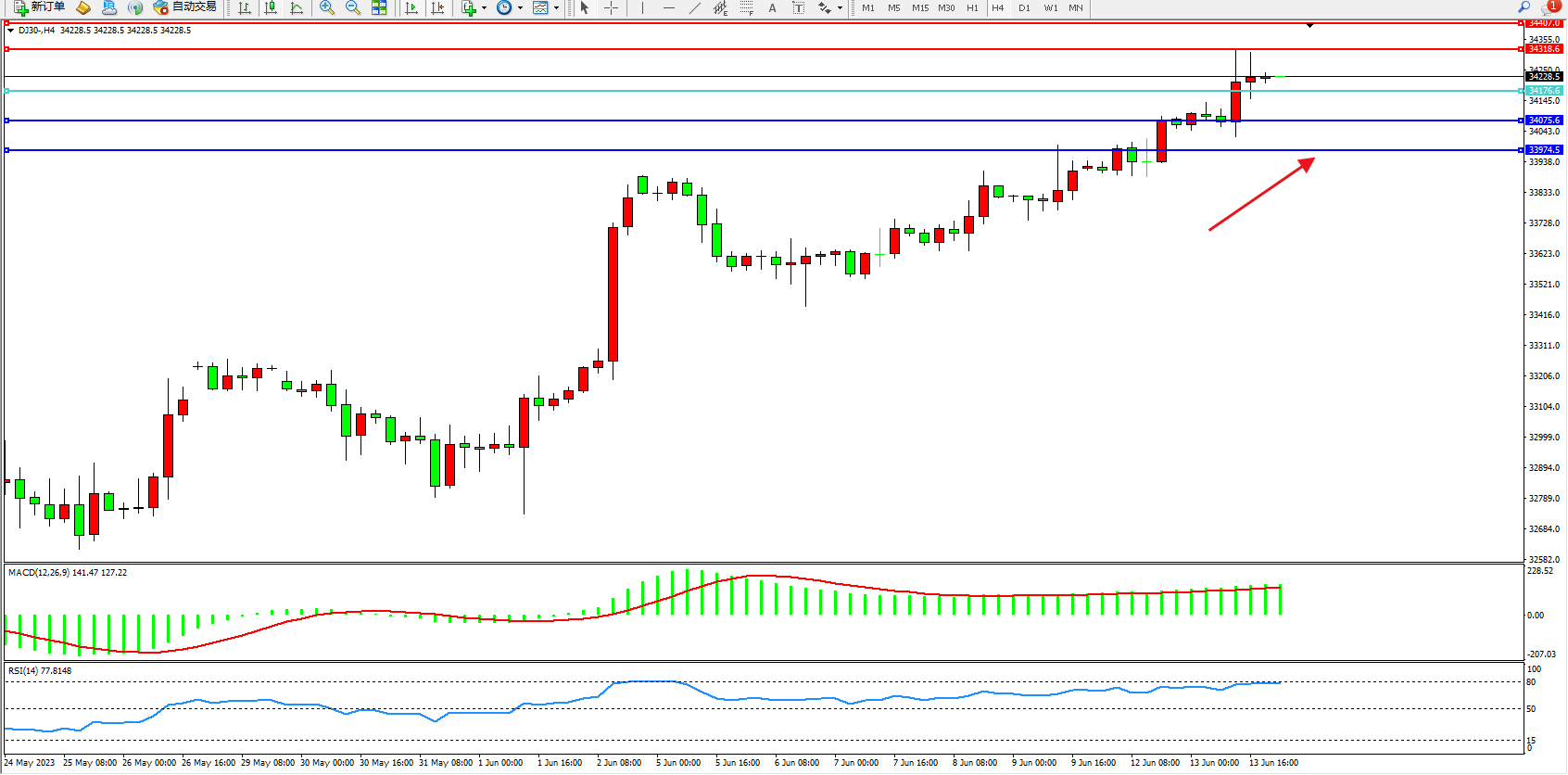 道琼斯指数6月13日(周二)收盘上涨145.92点,涨幅0.43%,报34212.25点;利率期货市场预计美联储6月暂停加息的可能性几乎为100%,7月份加息的可能性从一天前的约60%上升至66.5%。