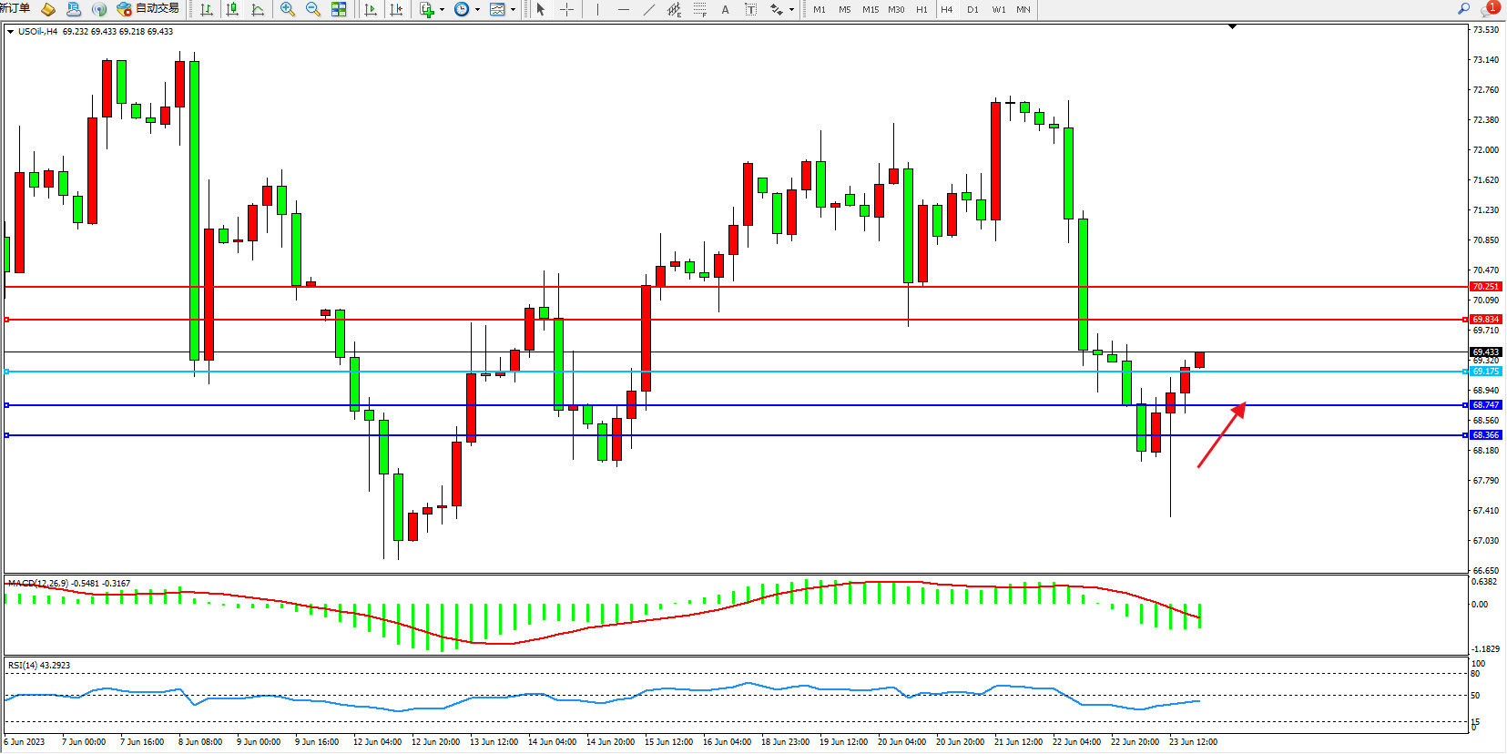 交易策略:69.175上方看涨,目标69.834 70.251