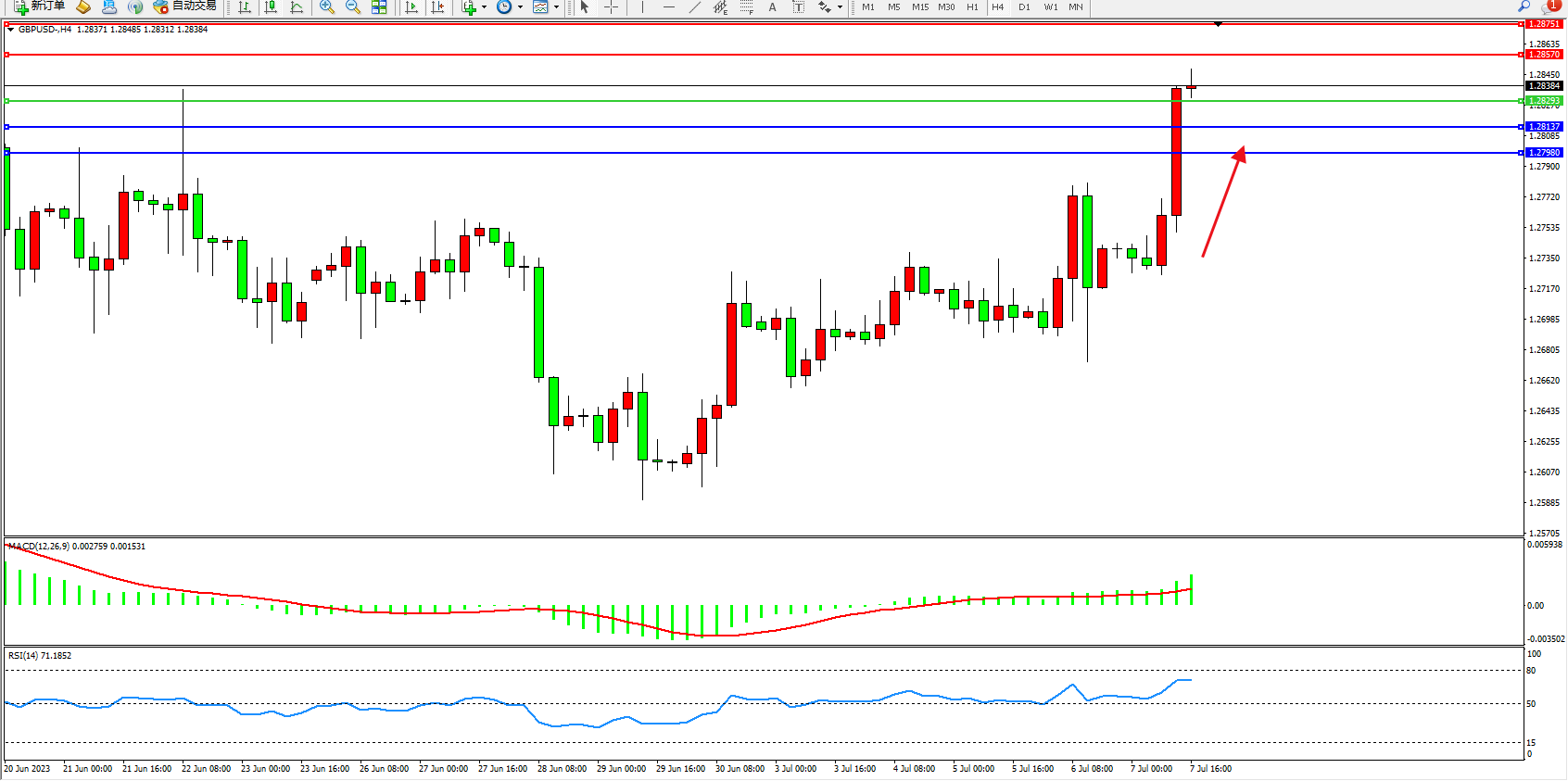 4小时图看:高位多头动力强势拉升上扬,短期有继续攀升态势,市场多头不断拉升中,MACD指标处于多头区域持续上移,RSI指标处于多头区域高位整理;