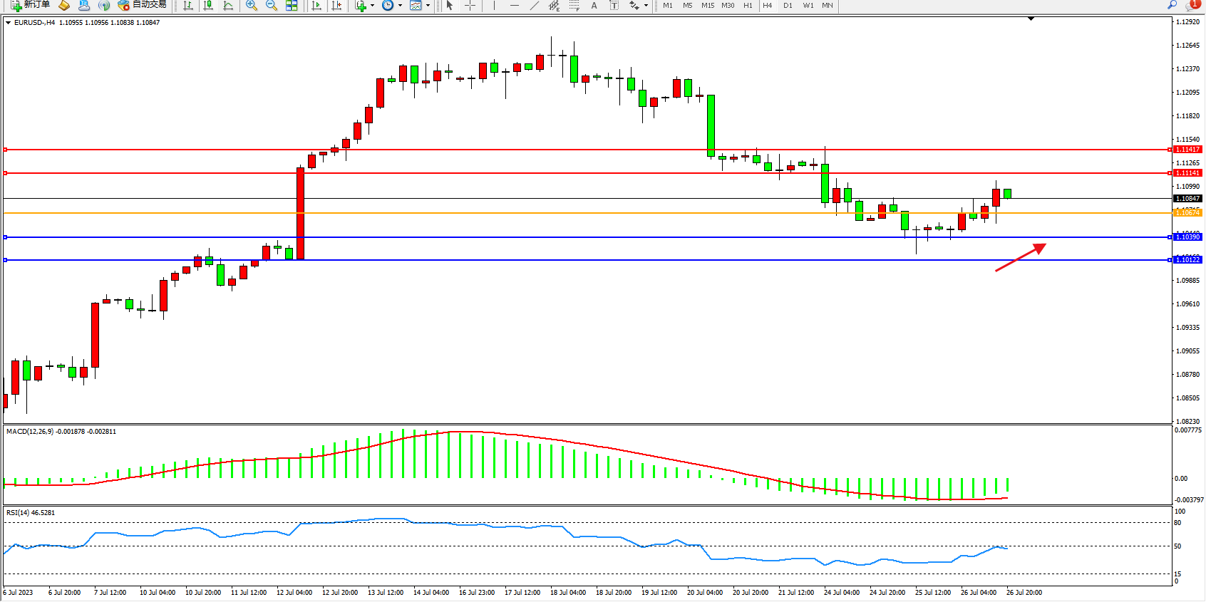 欧元美元EURUSD—4小时K线图显示: