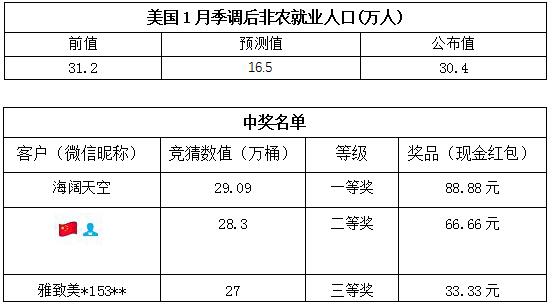 1月份非农就业人数大竞猜活动的中奖结果已出,获奖信息如下: