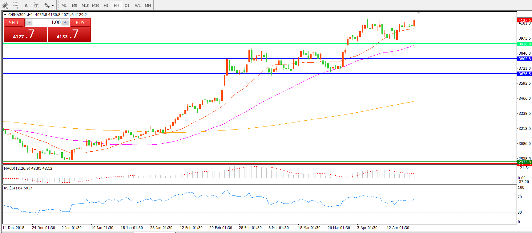 4小时图看,中华指数以21均线为支撑连续拉升,整体来看处于明显的上升趋势,第三次靠近上方阻力,重点关注4127一线得失。MACD红柱减少,RSI指标拐头向上,以多头思路对待。