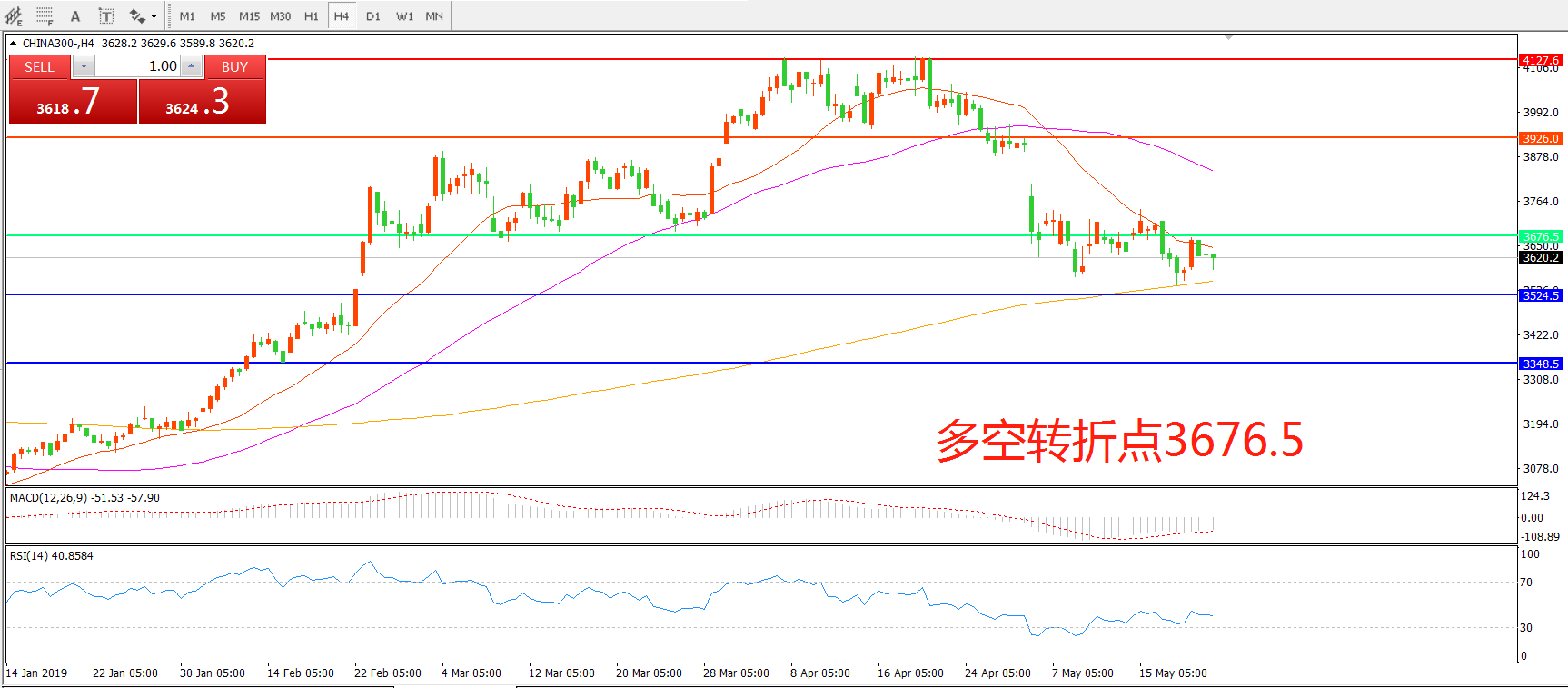 4小时图看,沪深300指数在跌破3676.5整理后震荡下行,振幅逐渐收窄, 200均线成为短期支撑,MACD绿柱缩短,RSI指标拐头向下,日内以震荡下行思路对待。