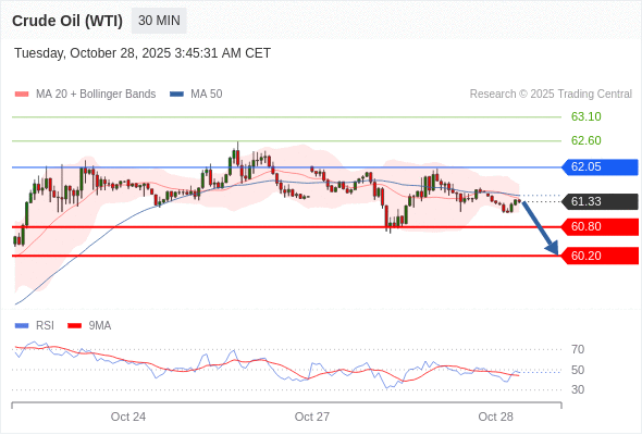 在 62.05 之下,看跌,目标价位为 60.80 ,然后为 60.20 。