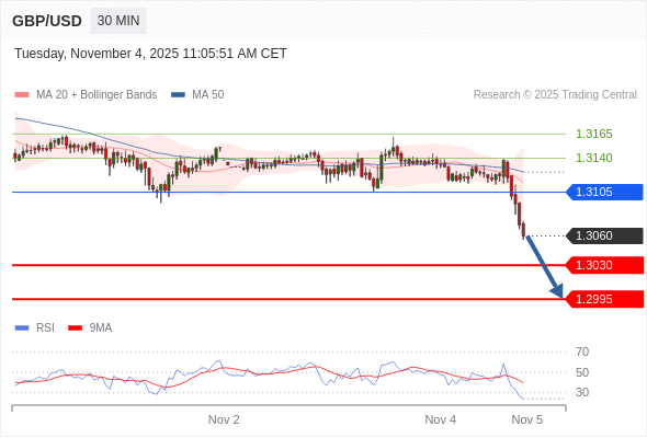 在 1.3105 之下,看跌,目标价位为 1.3030 ,然后为 1.2995 。