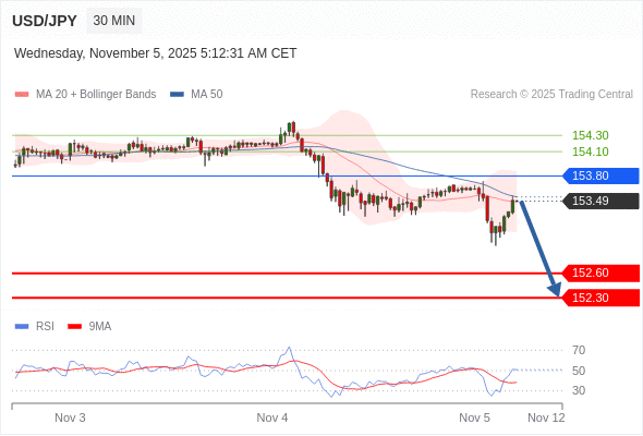 在 153.80 之下,看跌,目标价位为 152.60 ,然后为 152.30 。