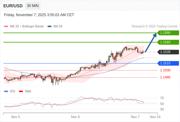 在 1.1515 之上,看涨,目标价位为 1.1560 ,然后为 1.1580 。